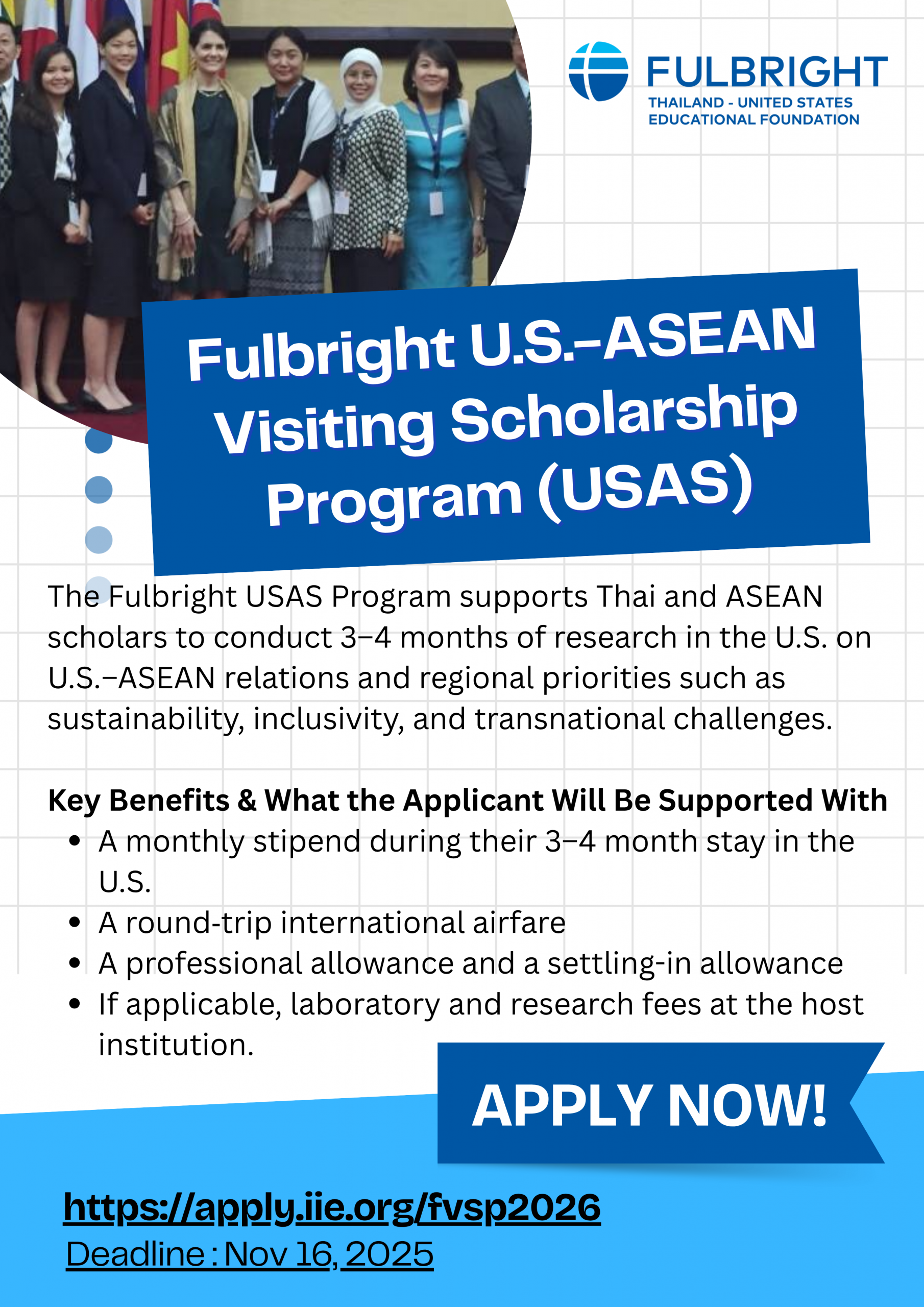 - Detailed Information : https://www.fulbrightthai.org/grants-for-thais/fulbright-u-s-asean-visiting-scholarship-program-usas